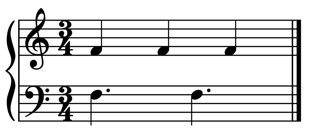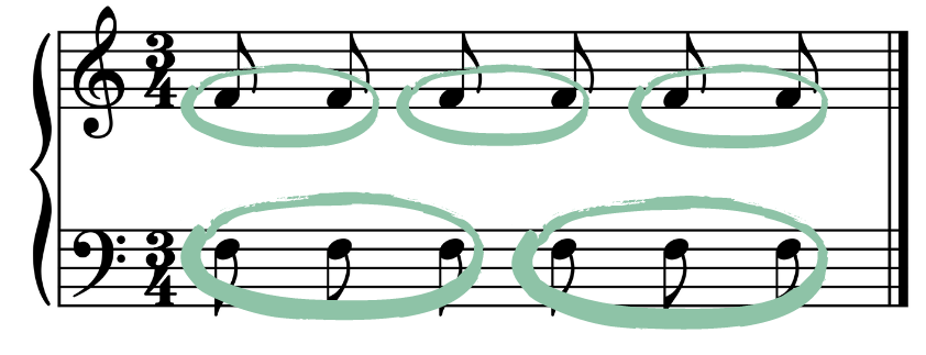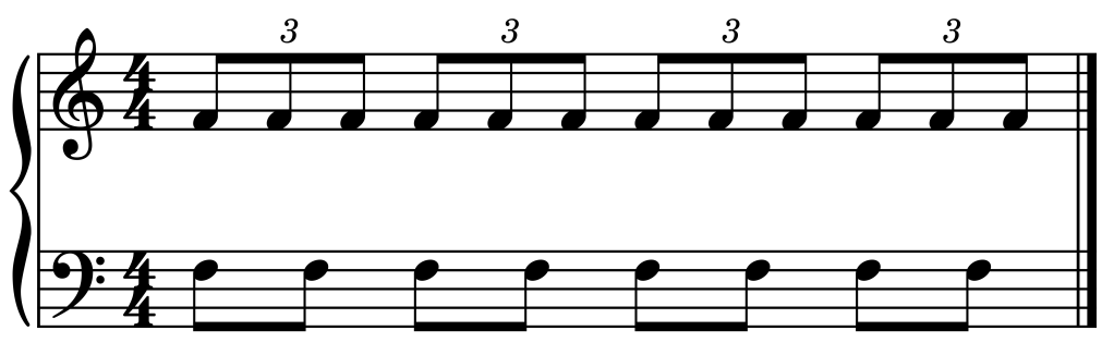 There are three notes against two in a measure. What if we convert it to a beat? Three notes against two on each beat, and here they are, triplets against eighth notes: