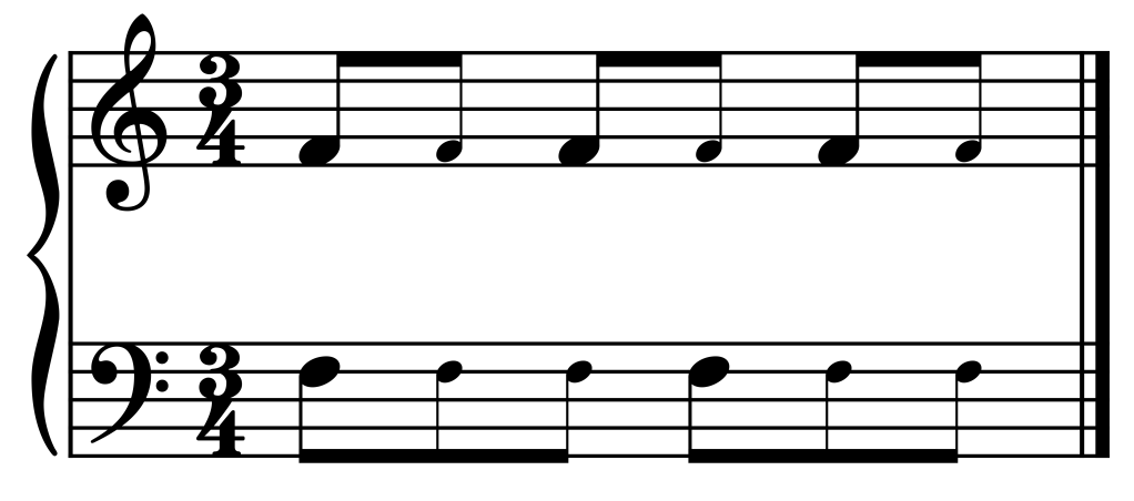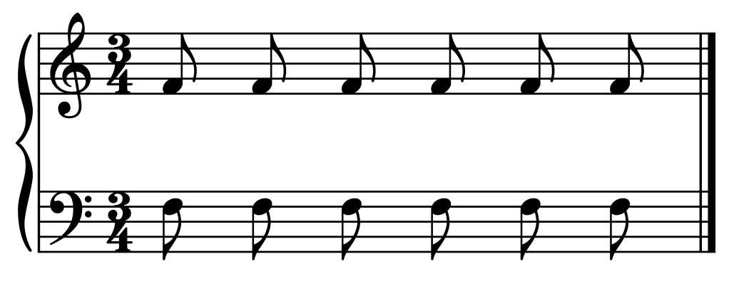 Let’s start with the common multiple of 3 and 2 on a piece of staff paper. Fill a 3/4 measure with 6 eighth notes as shown in the example below: