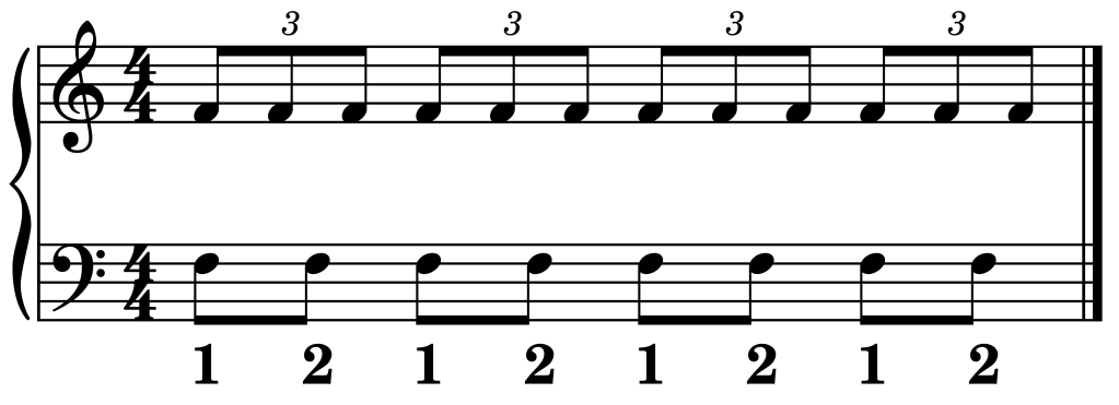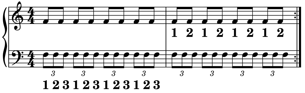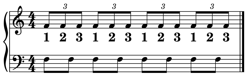As you can see in the example below, the right hand is tapping triplets, and the left is tapping eighth notes. With all that, count the triplets out loud.
